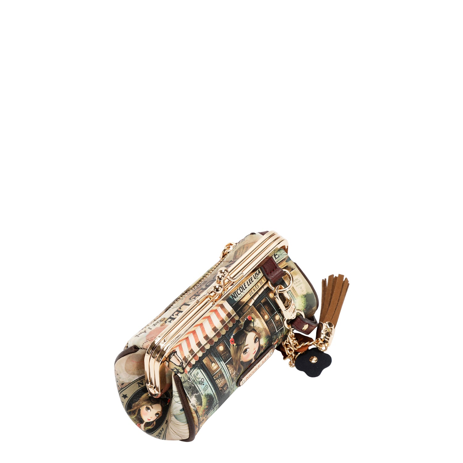 Chic in every way, our mini kiss lock purse offers 2 compartments and a wristlet strap with a flirty tassel and flower charms.
