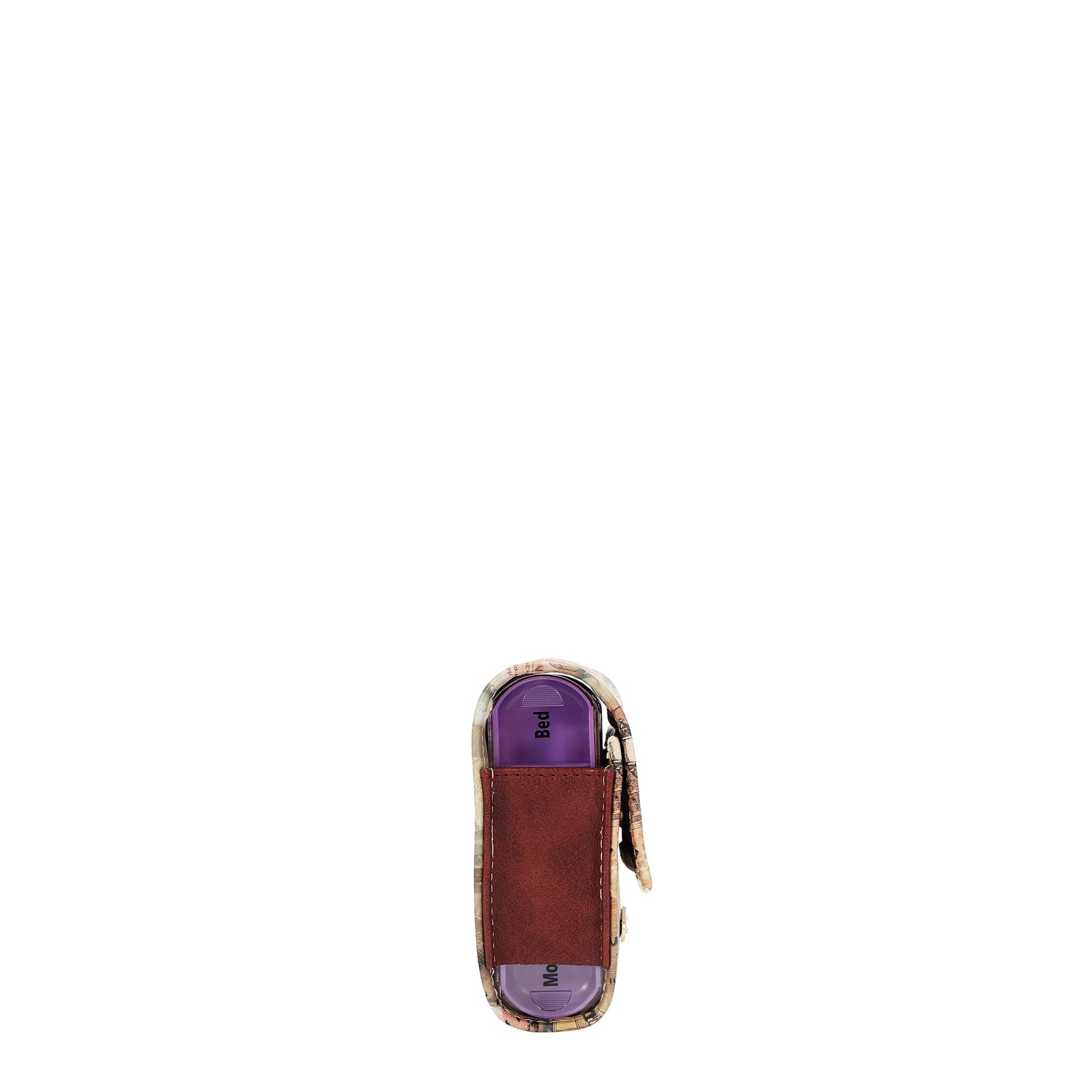 - Includes vegan leather pouch with fold-over flap and snap button closure and daily pill cases